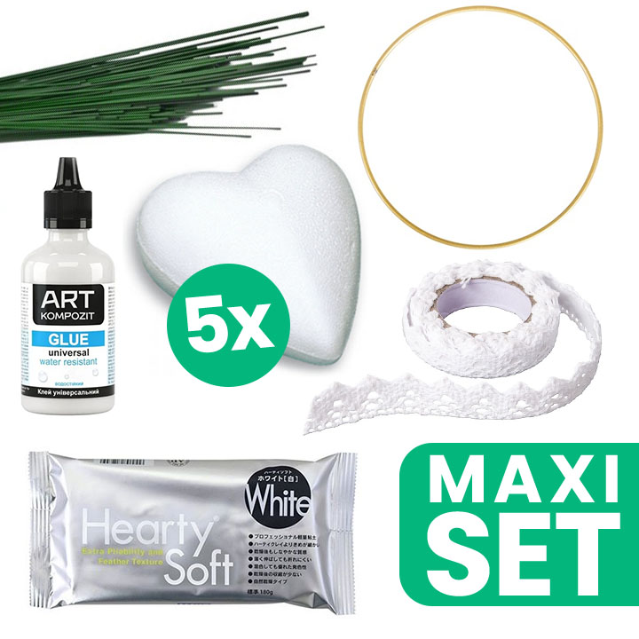 Elegantni komplet za ročno izdelovanje poročnih dekoracij je idealna rešitev za vse ustvarjalce, ki želijo ročno izdelati izvirne poročne dekoracije. Ne glede na to, ali pripravljate romantično dekoracijo za poroko, praznovanje, fotografiranje ali darilo, ta komplet vsebuje vse, kar potrebujete za ustvarjanje edinstvenih aranžmajev. Paket vsebuje zlat kovinski obroč s premerom 15 cm, ki služi kot podlaga za venec ali visečo dekoracijo, 10 kosov floristične žice za pritrjevanje elementov, 5 polistirenskih srčkov za okrasne motive, 1,8 m samolepilnega bombažnega čipkastega traku, super lahko samokaljivo glino Hearty Soft 180 g, primerno za modeliranje rož ali okraskov, in univerzalno vodoodporno lepilo 100 ml za zanesljivo pritrditev vseh delov. S tem kompletom lahko tudi popolni začetniki izdelujejo učinkovite ročno izdelane okraske. Rezultat bo nežna, romantična in elegantna poročna dekoracija