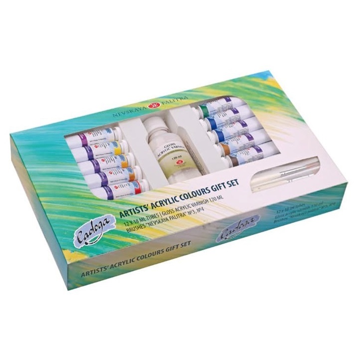Znamka slikarskega pribora Nevskaya Palitra, s pridihom ruske tradicije, Vam predstavlja nov darilni set akrilnih barv Ladoga. Barve so primerne za slikanje na različinih površinama kot so les, platno, papir, karton, keramika ipd. Tpne v vodi, pol-transparentne ali pokrivne, s srednje visokim in visokim sijajem ( , ), kar potrjuje njihovo kakovost. Set je izdelan za večkratno uporabo - plastična podloga je primerna za odlaganje barv. Pakiranje dopolnjuje tudi zaključni lak z leskom na bazi vode, ki se nanaša s čopičem, in se lahko nanaša v več slojih (med sloji naj se suši vsaj 4 ure na sobni temperaturi) Zakljuni sloj laka se suši 24 ur. Idealen predlog za darilo ki bo razveselilo svakega umetnika.