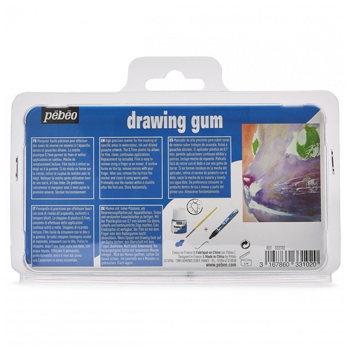 Odkrijte nova obzorja v umetnosti z markerjem Pebeo Drawing Gum, nepogrešljivim orodjem za vse, ki se ukvarjajo z akvarelnim slikarstvom, tako za profesionalce kot za navdušence. Ta natančni marker je posebej zasnovan za nanašanje risalne gume - zaščitnega medija, ki zagotavlja, da določena področja vašega dela ostanejo nepobarvana. S plastično konico 0.7 mm marker za risalni gumi Pebeo zagotavlja tanko in čisto črto, ki je idealna za podrobne risbe, zaključna dela, pisanje in učinke. Njegova trpežna konica se ne lomi in ne drsi, zato lahko delate brez prekinitev in z zaupanjem v popoln rezultat. Uporaba markerja Pebeo Drawing Gum je preprosta in praktična. Preprosto ga nanesite na mesta, ki jih želite zaščititi, po sušenju pa ustvari film, ki je odporen na vodo in razredčene barve. Po končanem delu ga nežno odstranite s prstom ali radirko, da razkrijete zaščitena mesta in občudujete kontrast med zaščitenimi območji in nanesenimi barvami. Pred prvo uporabo je treba marker aktivirati: z zaprtim pokrovčkom ga temeljito pretresite, da se kroglica v notranjosti premakne, nato večkrat pritisnite konico na papir, dokler se konica ne nasiči z barvo. Po uporabi je priporočljivo konico redno čistiti tako, da jo odstranite s podlage in sperete v topli vodi. Odvečni material zlahka odstranite s prstom. Po potrebi je v pokrovčku vgrajena nadomestna konica. Označevalnik za risalni gumi je treba hraniti v vodoravni legi, po aktivaciji pa bo pri zmernih sobnih temperaturah zdržal 12 mesecev. Marker je vsestransko orodje, ki nadomesti stekleničko risalnega gumija, čopič in posodo za vodo. Marker je zelo praktičen zaradi preprostega rokovanja in uporabe, ki zahteva le izbiro površine. Primeren je kot dopolnitev različice s stekleničko, ki je prilagojena za večje aplikacije.