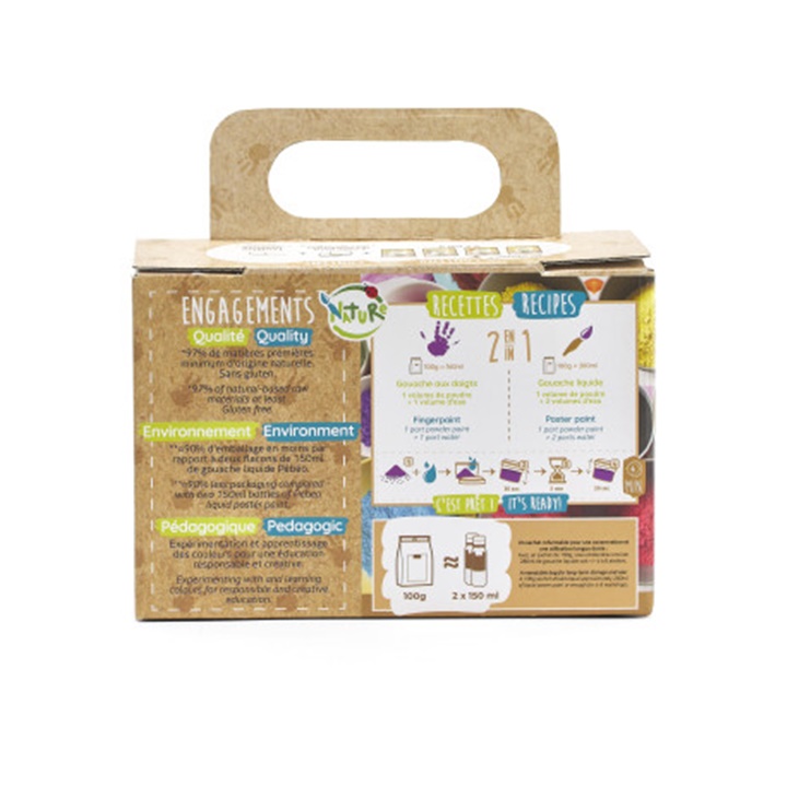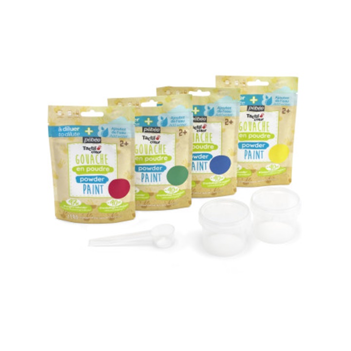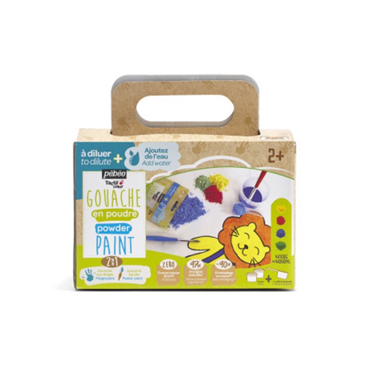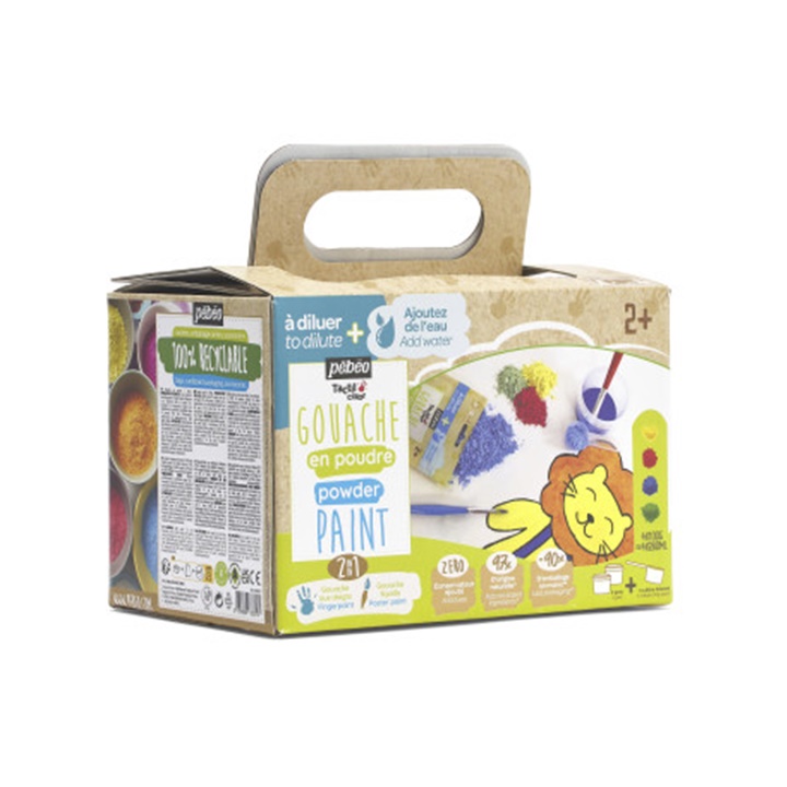 Predstavljamo barvo v prahu Tactilcolor gvaš proizvajalca Pebeo, 4x100 g. Predstavljajte si svet, v katerem se meje ustvarjalnosti premikajo z vsako potezo rok vaših malčkov. Ta svet postane resničnost s celotnim kompletom Tactilcolor, koncentriranim gvašem v prahu za otroke, stare 2 leti in več. Ta izvirna formula, sestavljena iz 97 odstotkov naravnih sestavin, je brez konzervansov, veganska, brez glutena in okolju prijazna, saj zmešate le toliko barve, kot je potrebujete za svojo dejavnost, s čimer se izognete odpadkom. Tactilcolor gvaš v prahu iz podjetja Pebeo se lahko uporablja na dva načina: kot gvaš za prste, če ga zmešate z enako količino vode, ali kot tekoči gvaš, če prah zmešate z dvakratno količino vode. Na ta način dobite barve z različno intenzivnostjo in učinek, podoben akvarelu. S temi barvami lahko delate na papirju, kartonu, lesu ali beli samoporjavitveni glini. Barve v prahu so bogate s pigmenti, prekrivne, po sušenju pa ohranijo svojo svetlost in ne zbledijo. Barvo pripravite v manj kot 4 minutah: Prašek z vodo v zaprti posodi stresajte 30 sekund, pustite počivati tri minute, nato pa ga ponovno močno stresajte še 30 sekund. Prašek se ne izsuši in se sčasoma bolje ohrani, pomembno je, da embalažo po vsaki uporabi tesno zaprete in shranite v suhem prostoru. Ker barvi niso bili dodani konzervansi, je priporočljivo ponovno zmešano barvo uporabiti še isti dan ali jo shraniti v hladilniku najpozneje do naslednjega dne. Barve se zlahka sperejo s kože z milom in vodo. Pri odstranjevanju madežev s tekstila površino takoj operite v topli vodi z milom in postopek po potrebi ponovite, dokler madež popolnoma ne izgine. Pri bolj trdovratnih madežih si lahko pomagate z odstranjevalci madežev, ki vsebujejo klor ali aktivni kisik, če je njihova uporaba združljiva z oblačilom. Ta komplet barvic ni le zabaven, temveč tudi varen, saj ima oznako CE, ki potrjuje skladnost z zahtevami evropske direktive o varnosti igrač.