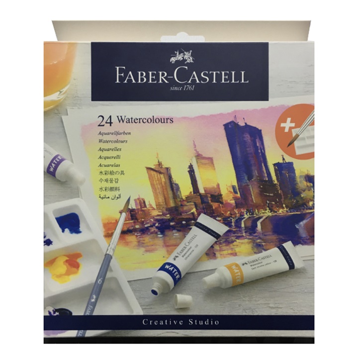Komplet akvarelnih barv v tubi s paleto znamke Faber-Castell ponuja kakovostne in intenzivne barve z visoko transparentnostjo, ki se medsebojno mešajo in zlahka razredčijo. Potopite se v skrivnost umetnosti s temi elegantnimi in zanesljivimi barvami. Komplet z 12 barvami vsebuje tudi trdno plastično paleto, v kateri je možno mešati posamezne odtenke. Komplet 24 barv vsebuje poleg palete še okrogel čopič znamke Faber-Castell velikosti 6.